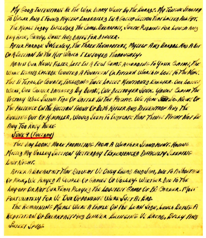 Something which should help to eliminate the rumour problem is the arrival in camp of two radios. We understand that at present they are capable of handling only long wave, but they expect to have them adjusted very shortly. Come on Nimitz! This indefinite waiting is wearing everyone down…