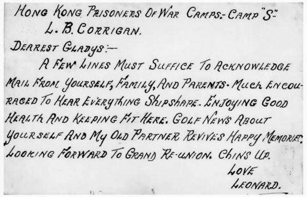 Rumour from the people outside, who claim to have heard it from the radio, is that a force left Manila at 5 p.m. last night headed for here. We “should” be seeing them tomorrow morning sometime if this is correct. We hear too that according to settlement terms, Hong Kong is to be made an international port with Kowloon reverting to the Chinese and we hear that these people (the Chinese) have already taken over Canton (evidently the South China Japanese forces surrendered to them) and are on the border of the New Territories waiting for the relieving force to come in here. It is said that the occupation of the colony will be accomplished by an international force of Russians, Yanks and British troops, said to be under the control of a British marine officer. I had hoped that we would get away from this rumour business but evidently it is not to be – for awhile anyway.