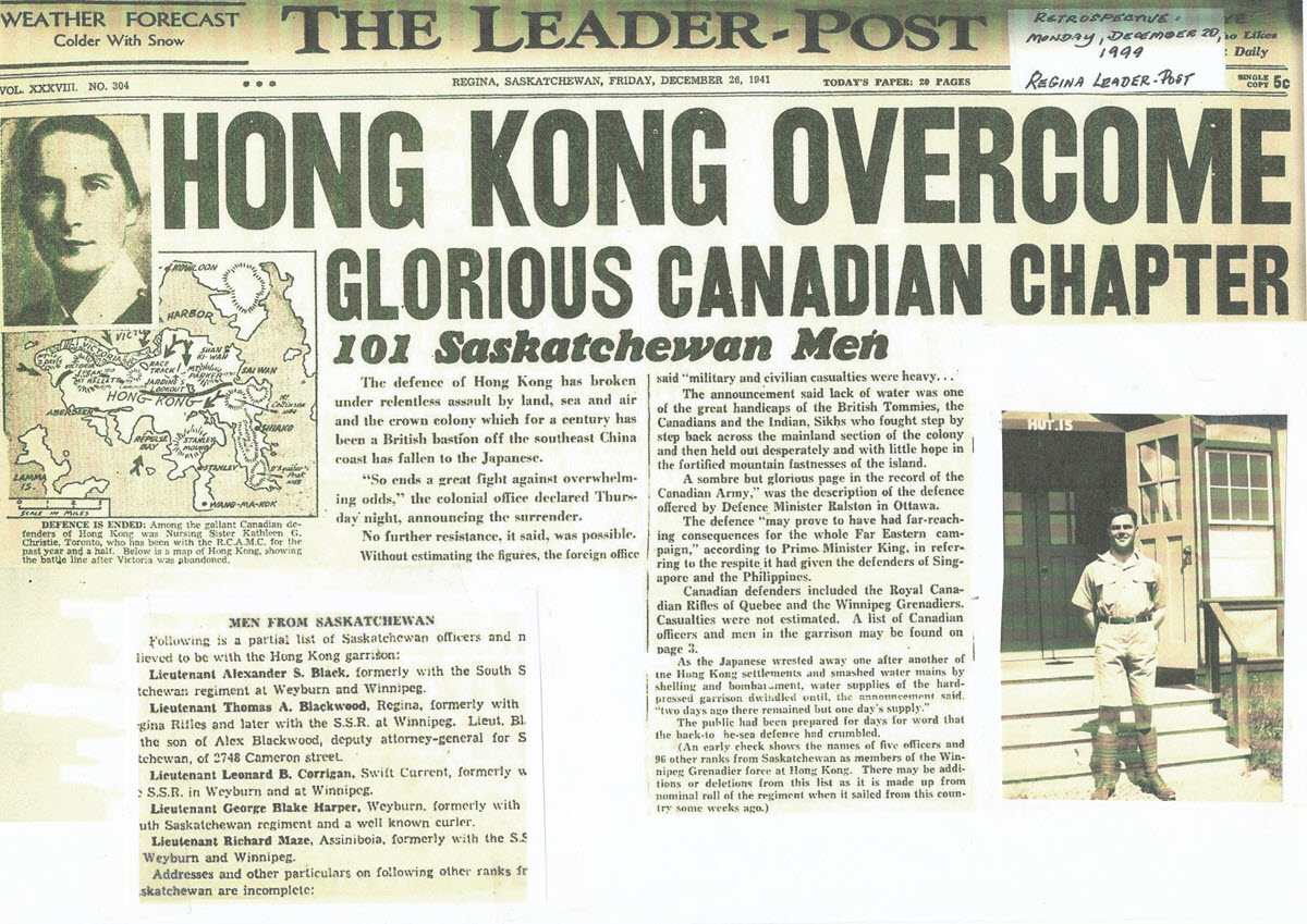 Newspaper headlines in Canada brought the shocking news to Canada. The Regina “Leader-Post” led off with a heavy black topline – “HONG KONG OVERCOME – GLORIOUS CANADIAN CHAPTER”.“The defence of Hong Kong has broken under relentless assault by land, sea and air and the crown colony which for a century has been a British bastion off the southeast coast of China has fallen to the Japanese”.