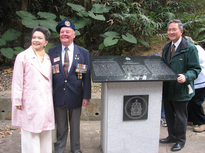 Uveiling the plaque at Jardine's Lookout. LtoR: Senator Poy, Hong Kong Veteran Bob "Flash" Clayton, Unanmed local representative. (VAC Photo) Click for larger view.