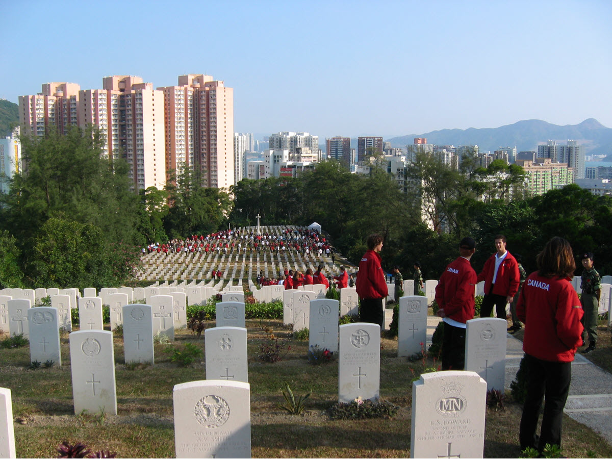 One of the highlights of our stay was the ceremony at Sai Wan cemetery on Sunday, December 4th, our third day there. Our 38-member delegation from HKVCA was impressed by a number of things. The site itself is rather spectacular, sweeping down from a hillside location, through the several hundred grave sites to the cenotaph located at the base of a series of stairs. As the guests descended the hill, on each side of these stairs were stationed Canadian students from seven Ontario High Schools acting as an honour guard along with the Hong Kong army cadets in their fatigues on the other side. The students, part of a 210-person delegation from Ontario, had just completed a four-city tour of China and were making this their very special final stop in order to bury a memorial capsule near the Canadian soldiers whose lives they had been studying in school this past year.