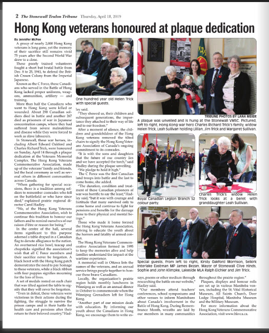 Posted on our Links page: Senator Jane MacAdam, paying tribute to 'C' Force soldiers who fought in the Battle of Hong Kong on December 7, 2023. Senator MacAdam is the daughter of George Palmer, RRC. (Submitted by Michael Palmer, grandson).