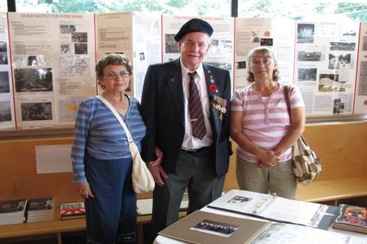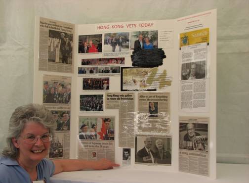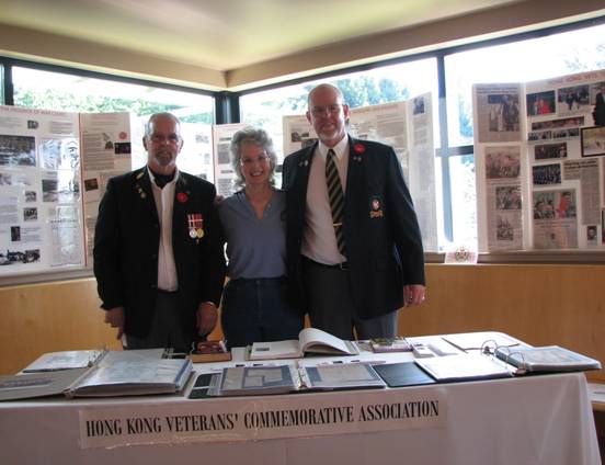 Linda had been working tirelessly for two months creating an incredible permanent ‘C’ Force educational display for our Region. Due to Linda’s efforts and hard work there is no doubt in my mind that our HKVCA display honouring the Hong Kong veterans stood out among all the displays that were present. Lee contributed with a display he made which focused on the hat badges and arm bands from the RRC, WG, and Brigade Headquarters. Lee also brought some memorabilia. We also had memorabilia from Gerry Gerrard and my father, Bill Doull. For hand outs we had HKVCA informational brochures, Memorial Wall brochures and Sgt. Gander bookmarks for the children. We had books for sale as well as an audio and visual display. Our rather large display was very well attended throughout the day. The picture below shows part of the display with Lee on the left, Linda in the middle and Murray on the right.