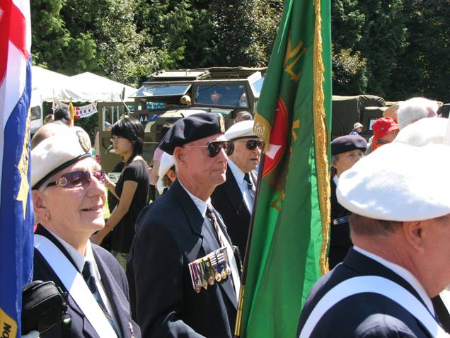 From 11:00 to 11:30 pipe bands paraded through the village. At 11:45 was the Parade of the Veterans led by the pipes and drums of the Seaforth Highlanders of Canada, the 78th Fraser Highlanders and the Vancouver Naval Veterans Association Colour Party. Gerry and John assembled with the veterans prior to the Parade. Gerry was carrying the Hong Kong Veterans flag and was very honoured when the Colour Party asked him to join them with the HK Colours. The parade formed and was led in by the RCMP, the pipes and drums, the Colour Party and the veterans. It was a very moving parade and hundreds of participants were clapping and honouring the veterans as they passed. The following pictures show Gerry carrying the Hong Kong veterans flag in the Colour Party and John marching with his fellow veterans.