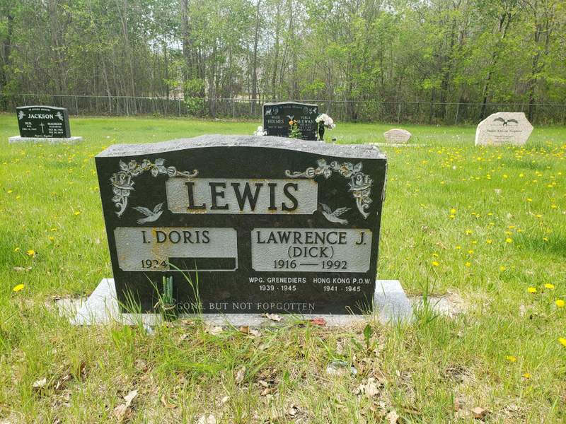 On Thursday, May 21, 1992 at the Seven Oaks Hospital, Dick Lewis, aged 75 years, of 430 Dufferin Ave., Selkirk, dearly beloved husband of Doris Lewis. Dick was born in Fisher River and lived his early years at Grand Marais, Man. During the war he served with the Winnipeg Grenadiers and was a prisoner of war at Hong Kong for over four years. He was employed at Booth Fisheries for many years at Selkirk following the war and later was with the security department at Lower Fort Garry. Dick was a life member of both the Royal Canadian Legion Branch No. 42 and the Army, Navy and Air Force Veterans Branch No. 151 and was also a member of the Hong Kong Veterans Association. Besides his loving wife Doris, he is survived by two sisters, Muriel and Bella and his stepchildren Harvey, Rose and Charles Mann. Funeral service was held on Monday , May 25 at 11 a.m. in the Gilbart Funeral Chapel, Selkirk with Rev. Peter Cain officiating. A prayer service and viewing was held in the chapel on Sunday afternoon at 4 p.m. His pallbearers were Doug Thomas, Val Sayer, Earl Paquin, Bert Brown, Harvey Mann and Ted Geard. Fellow members of the Legion formed an honor guard and held graveside rites at the burial at the St. Jude’s Anglican Church Cemetery at Grand Marais, Manitoba. The Gilbart Funeral Home was in charge of arrangements.
