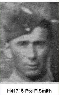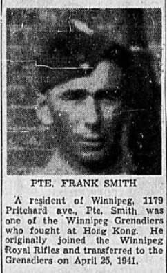 H41715 Frank SMITH Pte. FRANK SMITH - A resident of Winnipeg, 1179 Pritchard Ave., Pte. Smith was one of the Winnipeg Grenadiers who fought at Hong Kong. He originally joined the Winnipeg Royal Rifles and transferred to the Grenadiers on April 25, 1941.