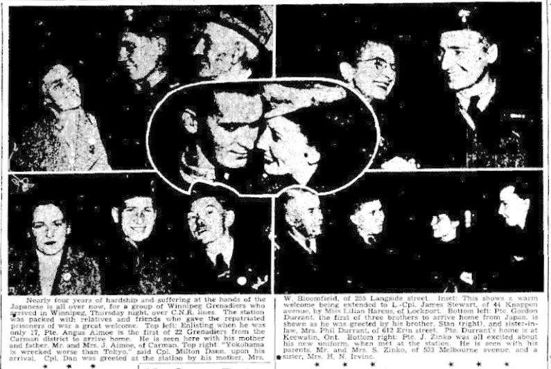 Nearly four years of hardship and suffering at the hands of the Japanese is all over now for a group of Winnipeg Grenadiers who arrived in Winnipeg, Thursday night, over C.N.R. lines. The station was packed with relatives and friends who gave the repatriated prisoners of war a great welcome. Top left: Enlisting when he was only 17, Pte. Angus Aimoe is the first of 22 Grenadiers from the Carman district to arrive home. He is seen here with his mother and father, Mr. and Mrs. J Aimoe of Carman. Top right: "Yokohama is wrecked worse than Tokyo", said Cpl. Milton Dann upon his arrival. Cpl. Dan was greeted at the station by his mother, Mrs. W Bloomfield of 255 Langside Street. Inset: This shows a warm welcome being extended to L-Cpl. James Stewart of 44 Knappen Avenue by Miss Lillian Harcus of Lockport. Bottom left: Pte. Gordon Durrant the first of three brothers to arrive home from Japan is shown as he was greeted by his brother Stan (right), and sister-in-law, Mrs. Phil Durrant of 612 Erin Street. Pte. Durrant's home is at Keewatin, Ont. Bottom right: Pte. J. Zinko was all excited about his new uniform when met at the station. He is seen with his parents, Mr. and Mrs. S. Zinko, of 533 Melbourne Avenue and a sister, Mrs. H. N. Irvine.