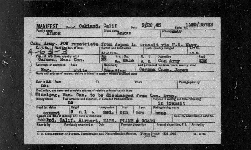 Members of 'C' Force from the East travelled across Canada by CNR troop train, picking up reinforcements enroute. Stops included Valcartier, Montreal, Ottawa, Armstrong ON, Capreol ON, Winnipeg, Melville SK, Saskatoon, Edmonton, Jasper, and Vancouver, arriving in Vancouver on Oct 27 at 0800 hrs.