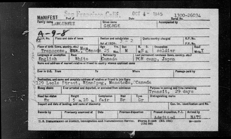 1945 Next of Kin: Mr. Joseph Adelard Lamoureux (father), 129 Leola St. East Transcona MB.MemberRoyal Canadian Legion Elmwood Branch, Winnipeg MB