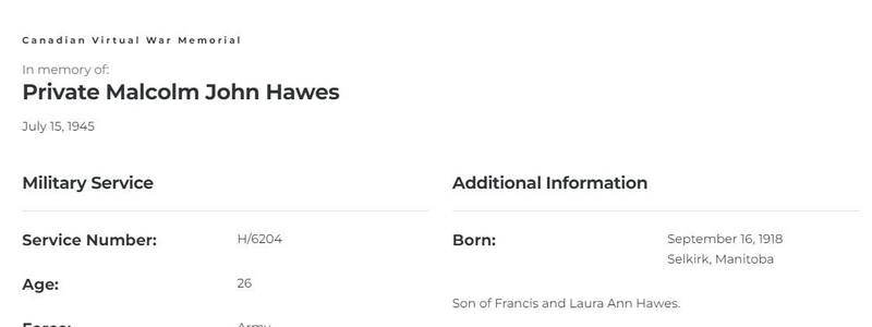 Others in the group spoke to Mrs. Harold Parker, daughter of Mrs. Hawes. They promised also to visit Pte. Hawes' wife, Dora, in Selkirk, Manitoba.