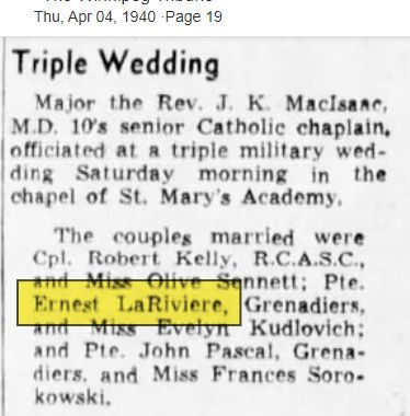 Son of Fred and Elizabeth Mary Lariviere of St. Vital, Manitoba. Brother of Alphonse, Ernestine, Eileen, Mary and Rose Mary. Husband of Evelyn Lariviere and father of Ernest Michael John of Winnipeg, Manitoba.