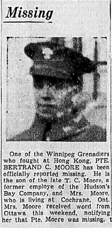 One of the Winnipeg Grenadiers who fought at Hong Kong, PTE. BERTRAND C. MOORE has been officially reported missing. He is the son of the late T. C. Moore, a former employee of the Hudson's Bay Company, and Mrs. Moore, who is living at Cochrane, Ont. Mrs. Moore received word from Ottawa this weekend, notifying her that Pte. Moore was missing.
