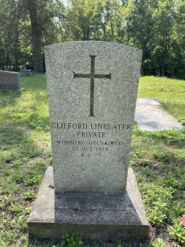 CLIFFORD DEMPSEY LINKLATER - On October 21, 1978 at the Deer Lodge Hospital, Clifford Dempsey Linklater aped 58 years of Grand Marais, Man., dearly beloved husband of Florence Linklater. Funeral service will be held Tuesday at 2:00 p.m. In St. Jude's Anglican Church Grand Marais with interment following in the parish cemetery. Born in Portage la Prairie, Mr. Linklater had lived most of his life in Grand Marais. He served overseas with the Winnipeg Grenadiers in the Second World War and was a member of the Selkirk branch No. 42 of the Royal Canadian Legion. Predeceased by his father Frank and his daughter Yuille Ann, he leaves to mourn his passing beside his wife eight sons, David of Grand Marais, Derence, Cleo, Keith Robin, John and Jay all of Winnipeg, and Douglas at home: three daughters, Stephanie of Winnipeg, Iris and Florence both at home; his mother, Mrs. Lina Linklater of Grand Marais; sister, Mrs. Doreen Labiy of Calgary; and six grandchildren. The Gilbart Funeral Chapel, Selkirk in care of arrangement