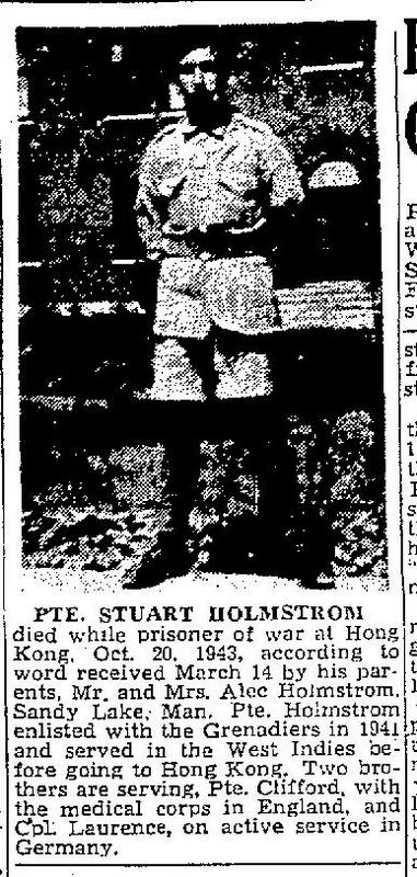 PTE. STUART HOLMSTROM died while prisoner of war at Hong Kong. Oct. 20. 1943, according to word received March 14 by his parents, Mr. and Mrs. Alec Holmstrom, Sandy Lake, Man. Pte. Holmstrom enlisted with the Grenadiers in 1941 and served in the West Indies before going to Hong Kong. Two brothers are serving, Pte. Clifford, with the medical corps in England, and Cpl. Laurence, on active service in E Germany.