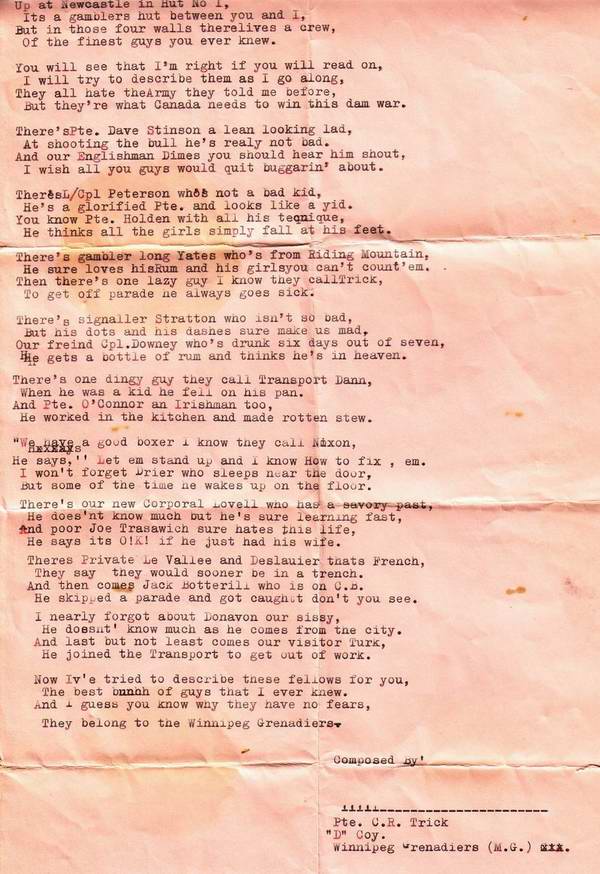 In my father's effects there was part of an old notebook or scribbler containing several hand-written poems. They are all in my Dad's writing, but there is no indication who actually composed them. There is one exception: A Prisoner's Return is credited to RSM Keenan.