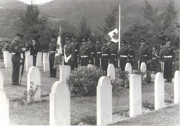 Peloton de tir de la prise d’armes des anciens combattants de la Bataille de Hong Kong. Photo prise à Hong Kong en 1966. Le sgt F.E. Christensen, CRGC, deuxième rang à gauche.