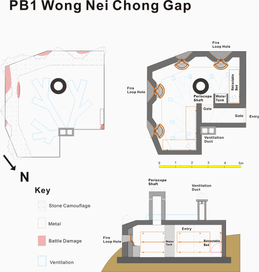 In remoter areas of Hong Kong – especially in terrain unsuitable for urban development – many pillboxes, brigade shelters, gun sites and other parts of the fixed defences survive. The biggest single complex that remains, the Shing Mun Redoubt just south of Jubilee Reservoir in fact saw little fighting. Historically more important are the shelters and pillboxes in the centre of Hong Kong Island (from Tai Tam, through Jardine’s Lookout, to Wanchai Gap in the north and Bennet’s Hill in the south) as these saw plenty of action.