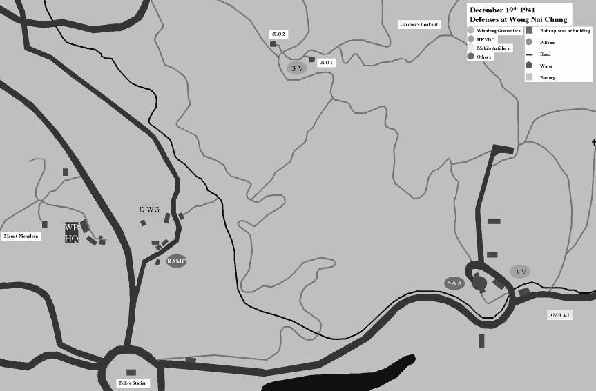During this time the defenders were organized into two Brigades. West Brigade, under Brigadier Lawson (the senior Canadian officer) consisted of the Punjabis, the Royal Scots, and the Winnipeg Grenadiers. East Brigade, under Brigadier Wallis, consisted of the Rajputs and the Royal Rifles. Both Brigades included elements from the Middlesex, the HKVDC, and supporting units.