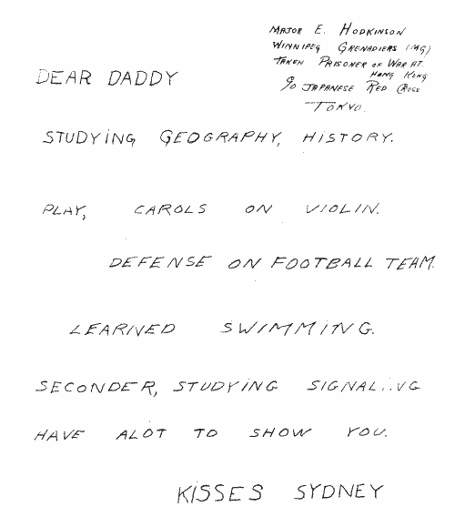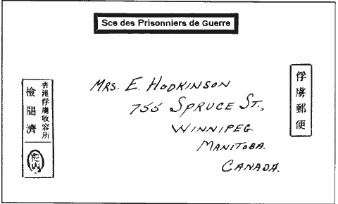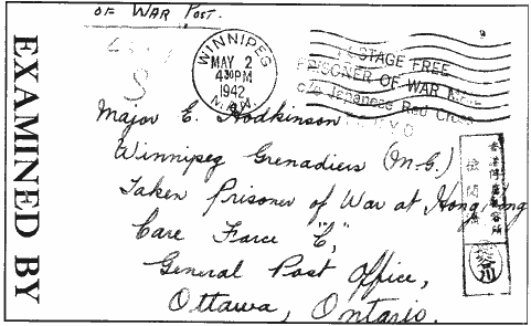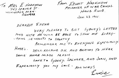 The date of Irene's first letter to Ernie is somewhat of a puzzle. She wrote it in April 1942 and addressed it to Major Ernest Hodkinson, Winnipeg Grenadiers, Taken prisoner of war at Hong Kong, Core of Force "C". This predates her first telegram telling her that Ernie was on an unofficial list of P.O.W.'s (see chapter four). She must have written this letter hoping that he was still alive, or she had unofficial information from some source.