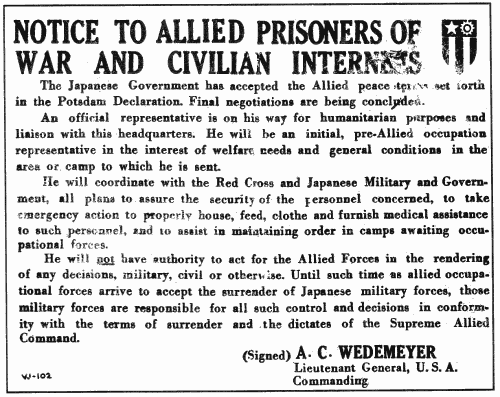 Back in Sham Shui Po, things changed almost overnight. On August 13th, according to a list of events recorded by Ernie, Tokanaga (the Japanese officer in command of the camp) summoned the Canadian officers and announced that "hostilities ceased at 3 a.m. 13th of August 1945". For the next two weeks, the prisoners were left to fend for themselves. The Japanese guards left the camp and the Americans flew over dropping a leaflet telling the P.O.W.'s that: