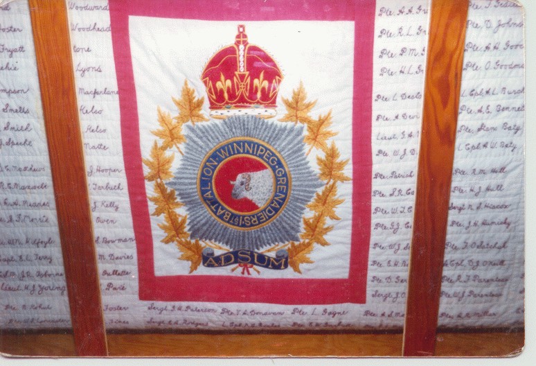 At the centre of the quilt is an embroidered W.G. Crest which was done by the GREY NUNS ORDER. The balance of the quilt is made up of 984 names of every man that served with the Battalion in Hong Kong. As the dead and missing were reported they were given to different ladies to embroider in panels of four. These names were then placed in the first layer around the crest. As the names of those that were prisoners continued to come in they were added in the same fashion, until all of our names were in the design. THIS IS A TRULY MAGNIFICENT EFFORT ON THE PART OF THESE LADIES AND THEY ARE TO BE FOREVER REMEMBERED. The Quilt was raffled off while we were P.O.W's to raise money for the cigarettes etc. The winner was Bill Hardings' sister and on his return home she presented it to him. Bill's feelings were that this should not belong to any one man and he looked around for a safe keeping place for it. As the Hong Kong Veterans did not have a Club Room and as Bill had spent many enjoyable days and visits in Pilot Mound, Manitoba visiting with Keith Stewart and the Agerbaks, he felt the Legion Branch there, if they were agreeable, would he a good place for it to repose.
