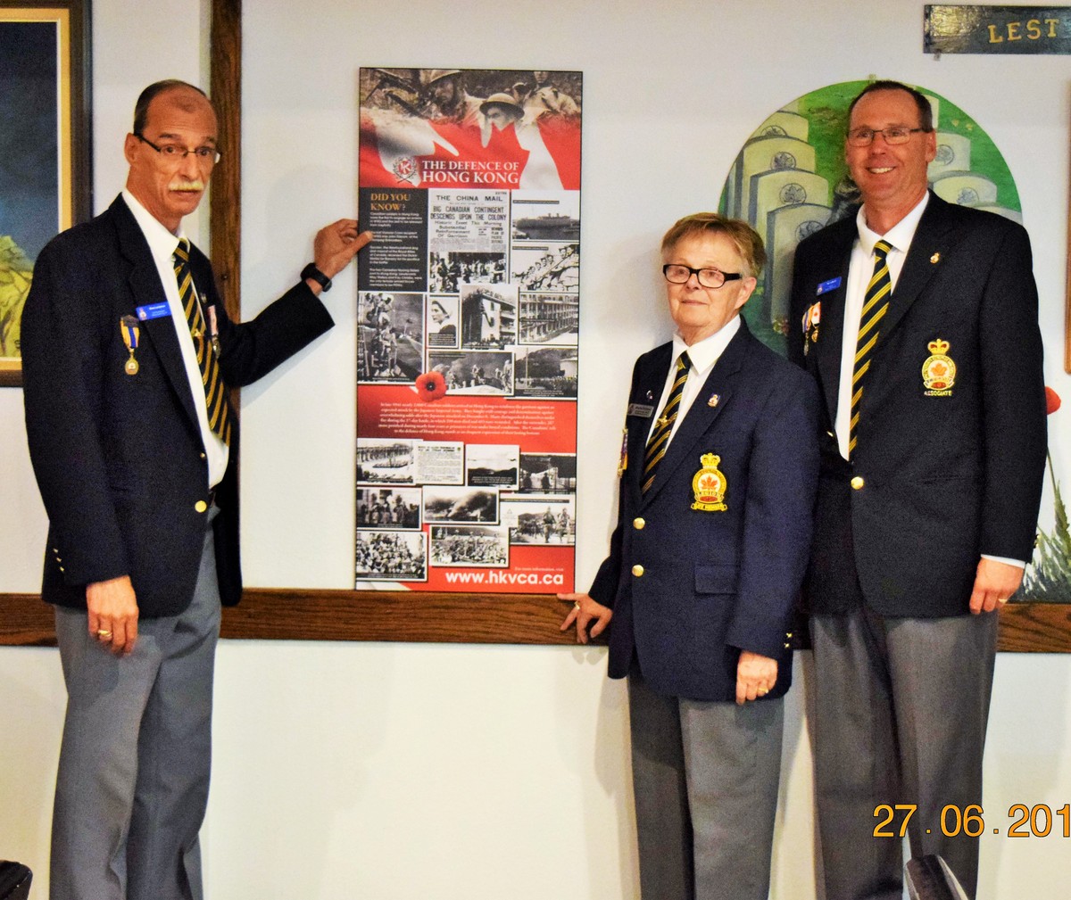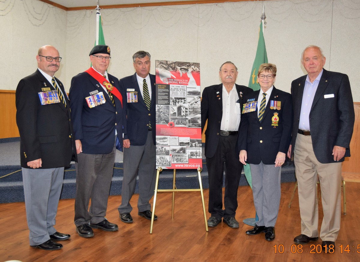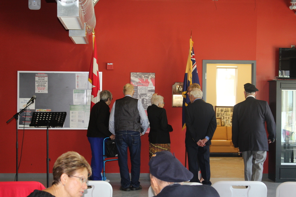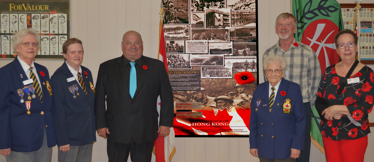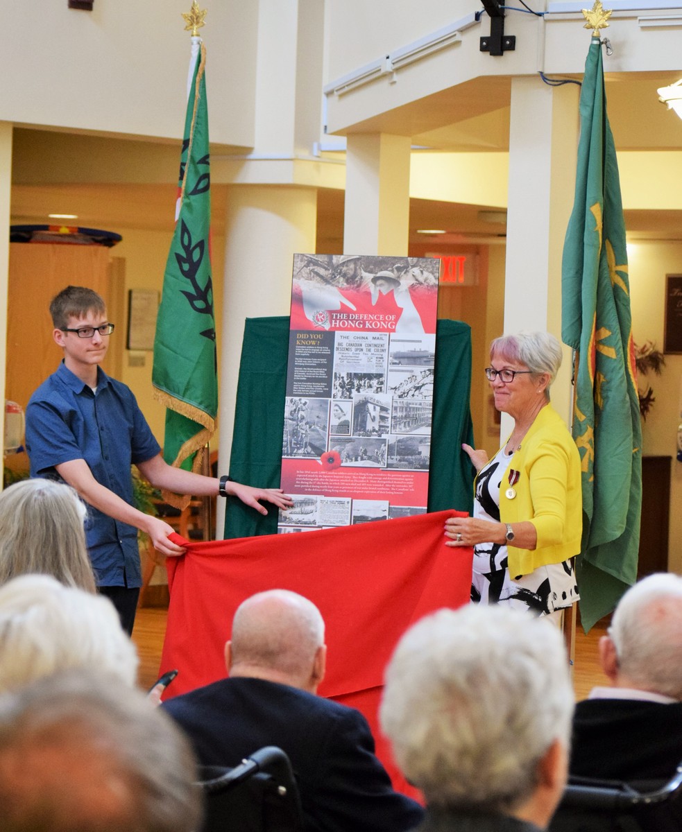 The plaque, honouring the almost 2000 Canadian soldiers including 290 that were killed in the mountainous terrain of Hong Kong, 500 who were wounded and 264 soldiers who died in captivity, was presented to the legion by Lori Atkinson-Smith on behalf of the Hong Kong Veterans Commemorative Association. Atkinson-Smith’s father, a member of the Winnipeg Grenadiers was himself a survivor and she is carrying on her father’s mission to educate people about the Battle of Hong Kong and the terrible cost. The Association exists, she continued, to “help ensure that this part of Canada’s military history is not forgotten.”