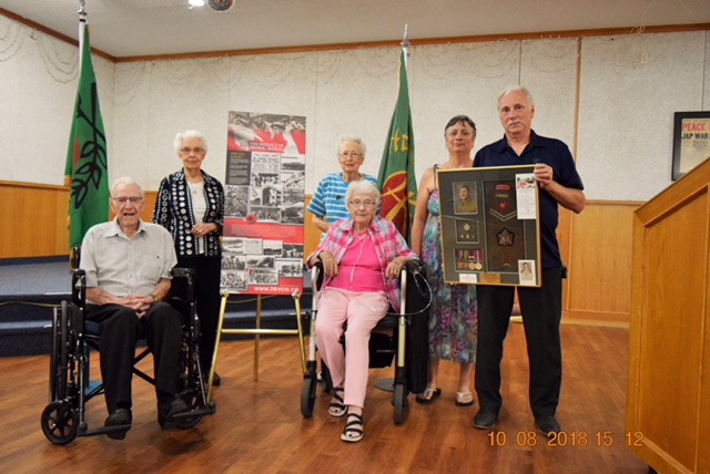 left to right- Clifford Pateman, Elsie’s brother, Elsie Hanel Jones, Dorothy McLeod, Jean Pateman (Clifford’s wife sitting) , Denise and Ken Pateman, Elsie’s nephew and his wife, holding Veteran Joe Hanel’s memorabilia.