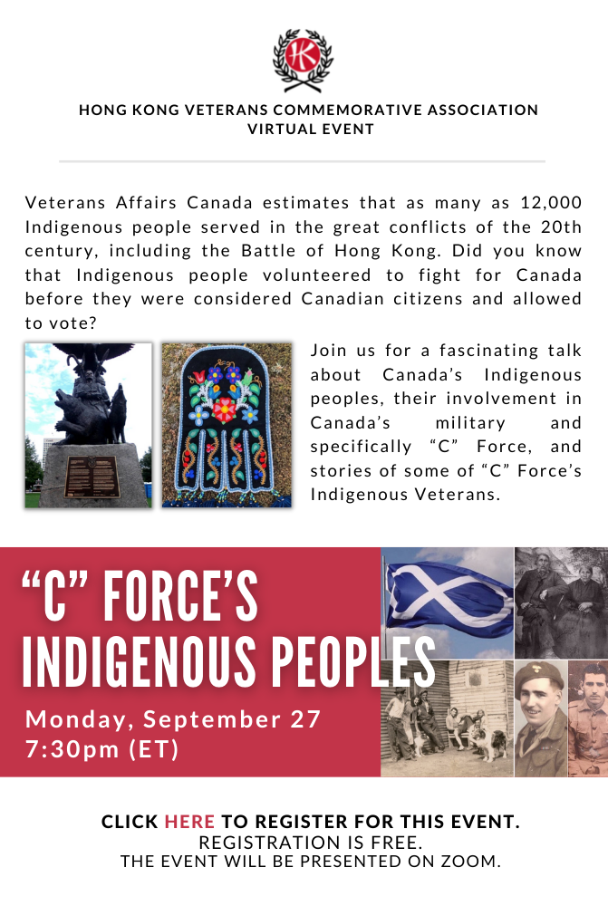 | Sept. 27 | 7:30pm (Eastern) | Indigenous Soldiers in ‘C’ Force: presented by Pam Heinrichs (Poster at the end of this newsletter) |