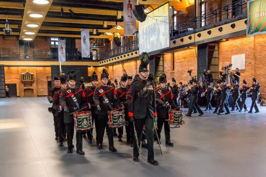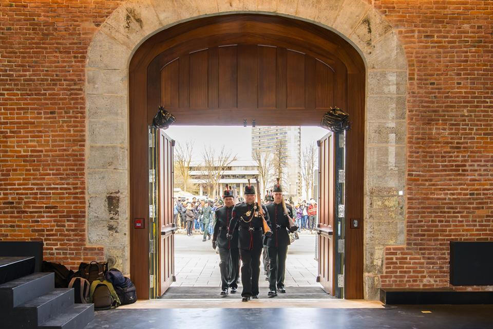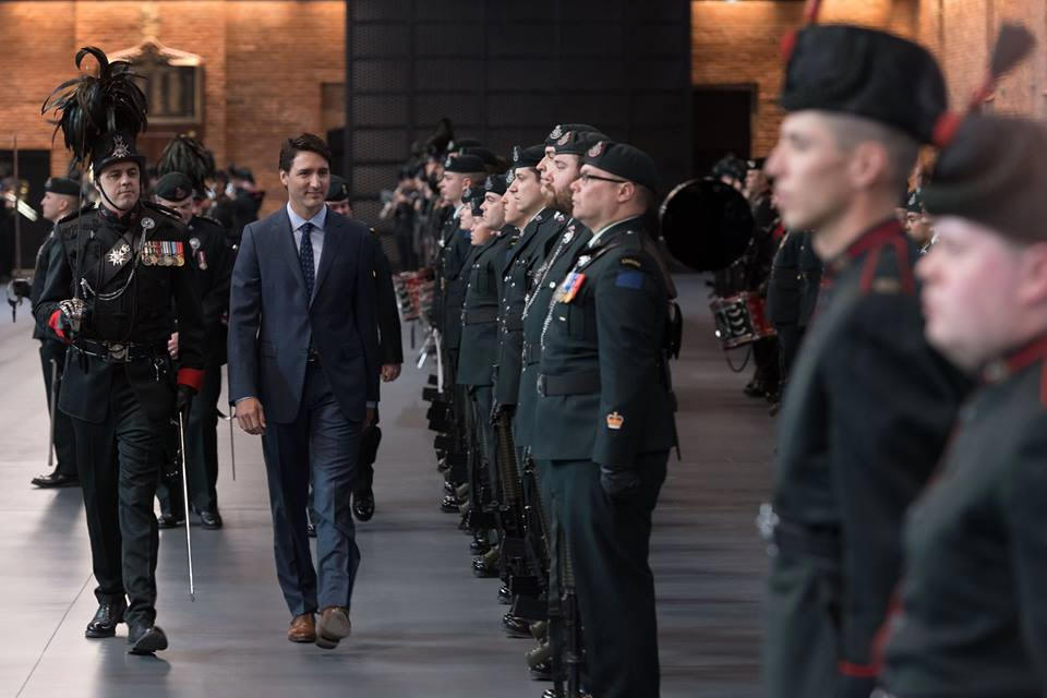 In the newly rebuilt drill-hall, 10 years after the fire that destroyed the building in April 2008, the Parade entered with the Voltigeurs Colours, the change of command ceremony and the inspection of the Troops by the Honourable Prime Minister Justin Trudeau. He was then named Honorary Member of Les Voltigeurs de Québec. After speeches and the departure of the Prime Minister, the new historical site with its German cannons captured by our Canadians during the battle of La Crête de Vimy (1917-18). was inaugurated