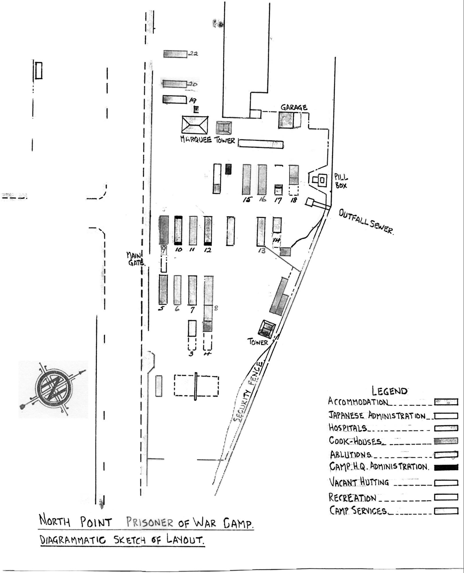 North Point Camp had originally been built in 1939 by the Hong Kong government to house Chinese refugees. It had been badly damaged during the battle and some of the buildings had been burned and looted. The Japanese had stabled their horses there and large piles of manure and garbage attracted huge numbers of flies and other insects.[370] The sleeping huts had few doors or windows and offered little protection from the weather. For the first few weeks, sanitary arrangements were totally inadequate; there was no running water and latrines had to be improvised along the seawall.[371] Rifleman Ken Cambon was one of the prisoners at North Point. He later wrote: