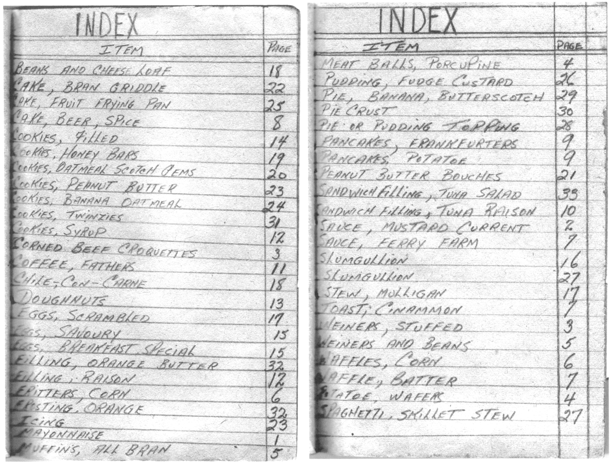 Within the camp, different men sought a variety of diversions from their difficult situation. Don Penny was a member of the recipe group. A small, blue covered notebook was one of his war-time mementoes.[400] In it he recorded over thirty recipes, instructions for various drinks, and a list of food-related “Things to try.” The recipe index on the last two pages lists a wide range of items, from the mundane (Pie Crust; Toast, Cinnamon; Wieners and Beans) to the more elaborate (Pudding, Fudge Custard; Corned Beef Croquettes; Slumgullion; Banana Butterscotch Pie). Also in the notebook Don wrote out, “My first meal that I will buy,” his contribution to another common topic of conversation.
