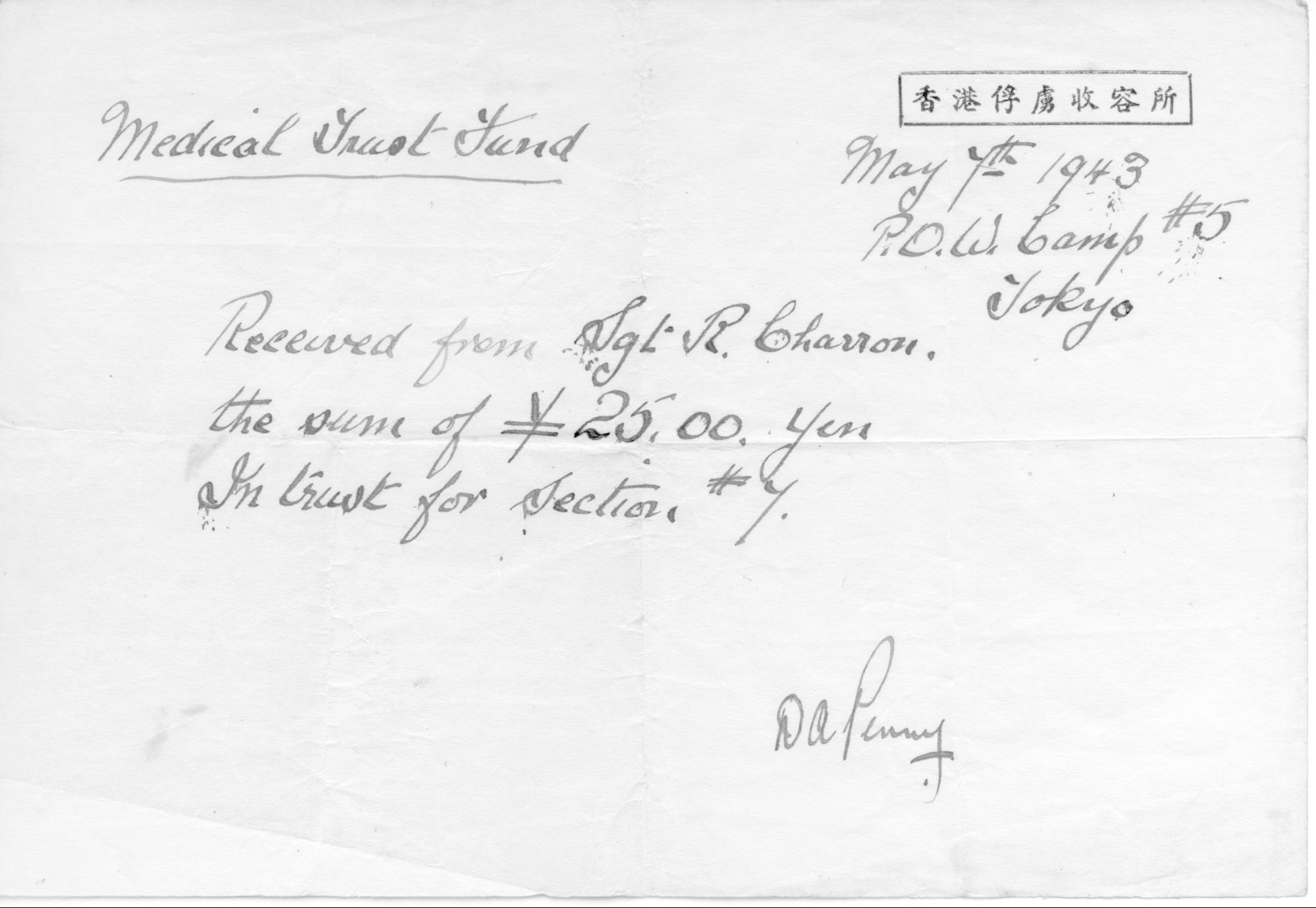 This philosophy turned out to have positive results as the men in his camp would later attest. “…you’d have to be something out of this world to do the job he did after we went to Japan,” said Lee Speller.[684] Only about twenty-five men died during twenty-eight months at Kawasaki 3D, a much lower mortality rate than at most of the other camps in Japan. One of the contributing factors may have been the medical trust fund that Capt. Reid set up, to be used for purchasing medicines, critical supplies and extra food. Each of the men contributed to their own section fund, as indicated by a receipt brought back to Canada by one of the POWs showing that Sgt. R. Charron contributed twenty-five yen to the Section #7 medical trust fund.[685]