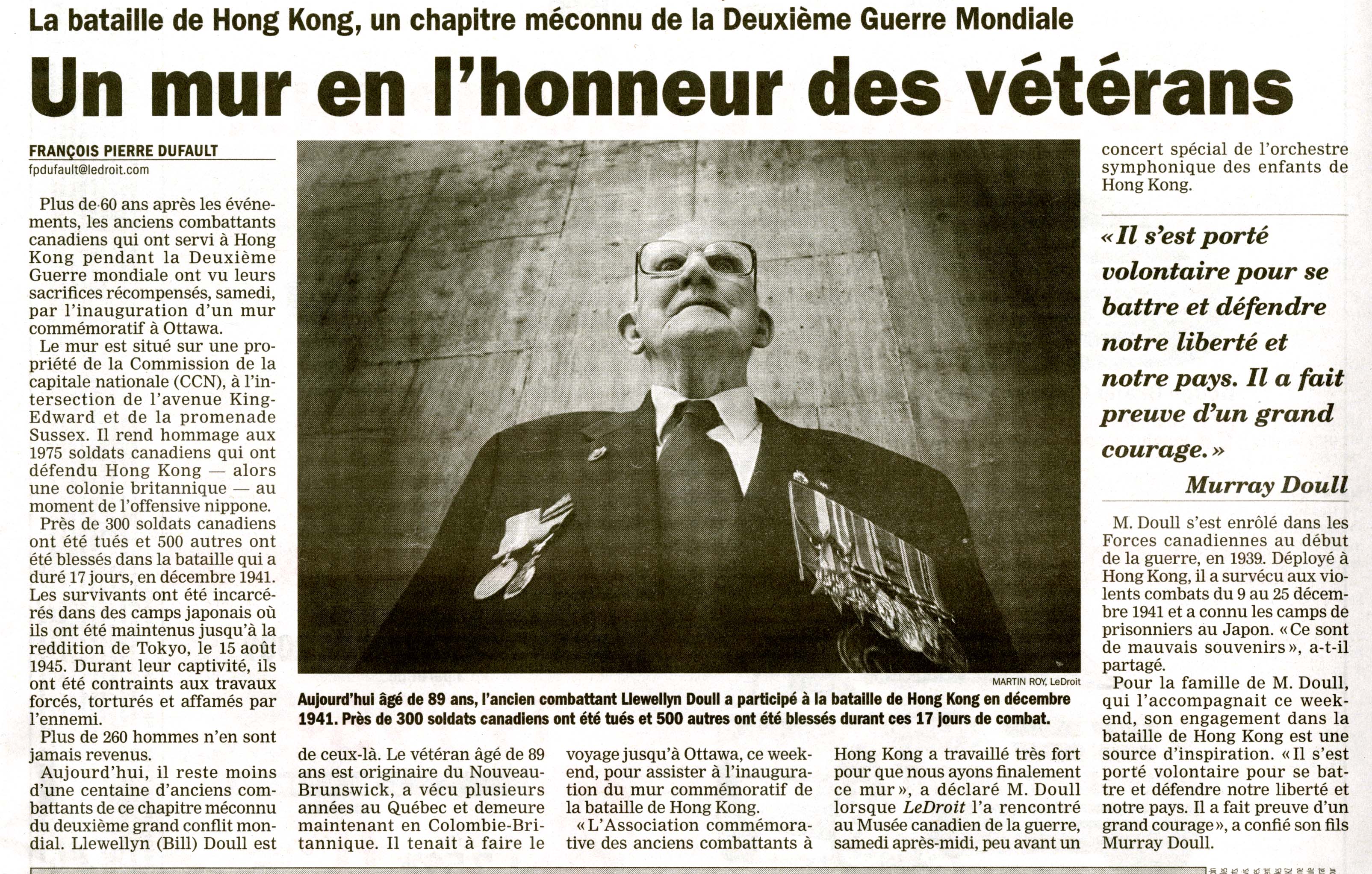 Un Mur en l'honneur des vétérans (JPG image)- An article that was in the Monday edition (17 Aug) of the Ottawa French speaking newspaper, "Le Droit". The photograph of Llewellyn (Bill) Doull was taken at the National War Museum on Saturday 15 August, after the HK Memorial Wall dedication ceremonies in Ottawa. (Submitted by Murray Doull)