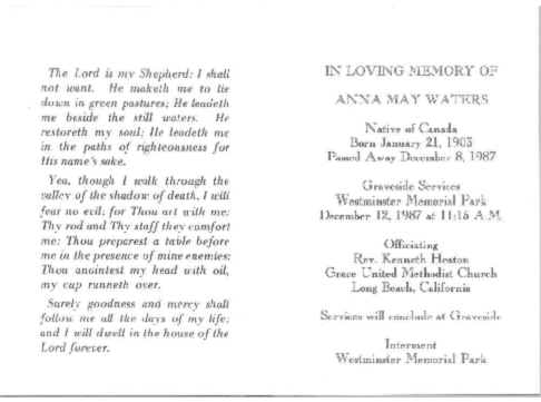 Anna May Waters passed away December 8, 1987 at age 84. There was a quiet graveside funeral to mark the passing of this wonderful lady. She loved life and lived it well.
