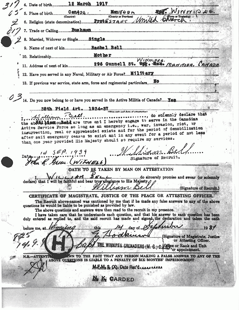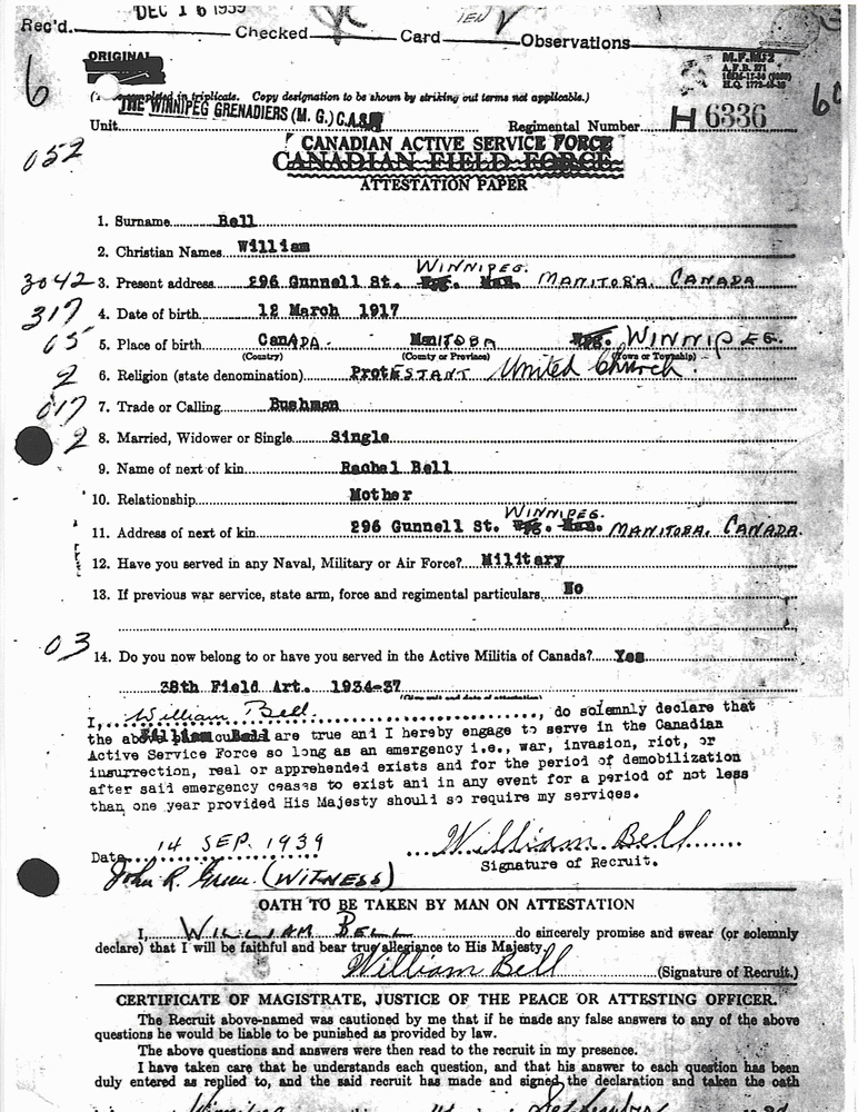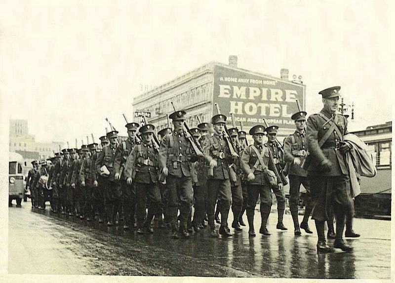 On August 27, 1941, the Grenadiers were recalled from Jamaica to return to Winnipeg. September 27th, 1941, we embarked at Kingston and arrived in Montreal, Quebec on October 10th, 1941. The regiment then traveled on to Winnipeg. Along with the other Grenadiers, I received 9 days furlough with pay in Winnipeg, from October 11th to October 20th. I remember upon our return to Manitoba that the Winnipeg Grenadiers lost quite a few members who transferred to other regiments. I was assigned to go out onto Portage Avenue in Winnipeg to recruit new members to replace those lost in our regiment.