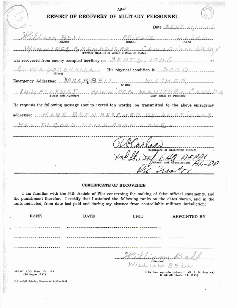 "WILLIAM BELL IS NOW SAFE IN ALLIED HANDS IN YOKOHAMA. HEALTH - GOOD."