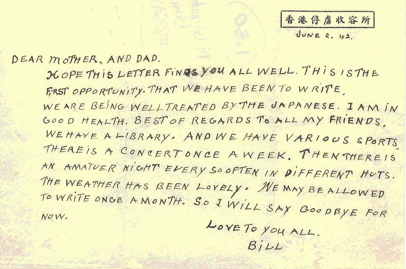 Another letter received by family on November 4th, 1943, from James Downie in a Yokohama Camp advises that "We are being treated well by the Japanese. I'm here with Bill Morris, Nicholson, Chick Query, Frank Breakwell, Roy Stodgell, William Bell, Jack Stephens, Bill Hall, Jim Houston and Fred Gard." These letters were always censored by the Japanese, and if any mention was made of the war the letters would be filtered out.