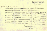 On September 6th, 1944, my family received a letter from Colonel Clarke advising that, "The Gripsholm had recently arrived in Japan with enough supplies for 3100 persons for six months including medicine, food, shoe repair material, and Red Cross parcels". Word was also received by families that the Red Cross hoped to have a cable service established soon so that messages could be sent between Hong Kong prisoners and relatives. They would be allowed one cable per year, paid for by the Red Cross, consisting of only 10 words. Later that year word was received by the family that letters could now be sent to the POW camps and should be addressed to "Huryojohokyoku", meaning "Prisoner of War Information Bureau". A limit of one letter per month consisting of 25 words per letter would be allowed. Letters to POW's required prepaid postage of 5 cents.